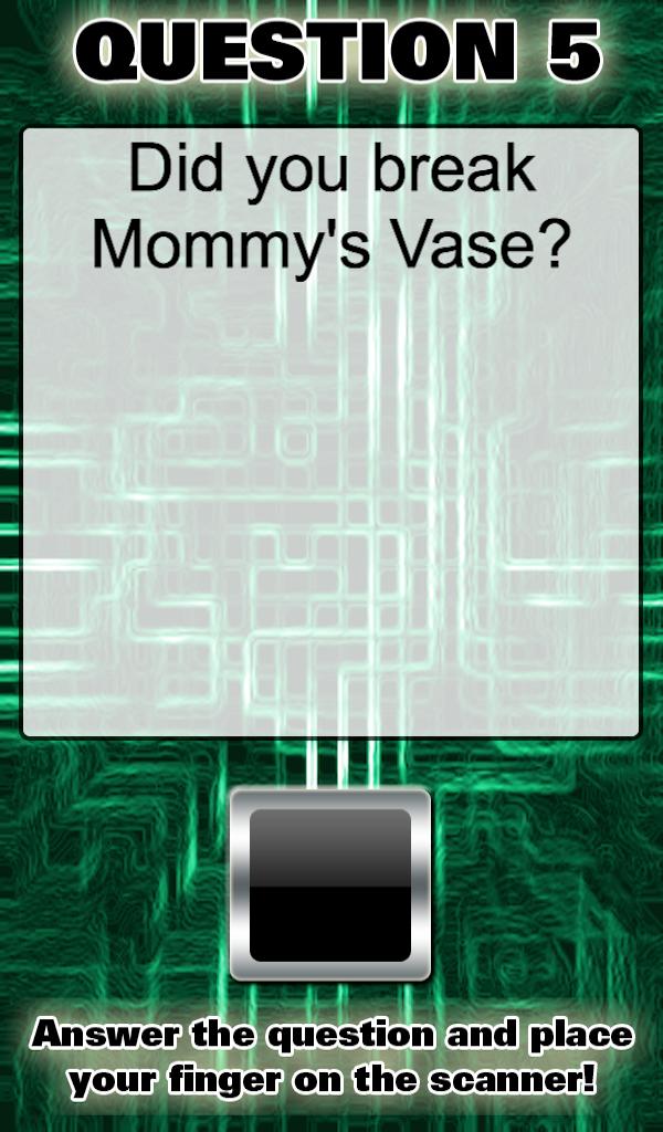 Richten Sie die Fragen ein, die Sie stellen möchten, zusammen mit dem gewünschten Ergebnis (wahr oder falsch). Stellen Sie zuerst ein paar einfache Fragen und stellen Sie dann eine Frage, von der Sie wissen, dass Ihr Kind oder Freund lügt! Geben Sie dann die App Ihrem Kind/Freund und bitten Sie sie, ihren Finger auf den Scanner zu legen und die Fragen zu beantworten! Das war's! Sie werden zugeben, dass sie in kürzester Zeit liegen!